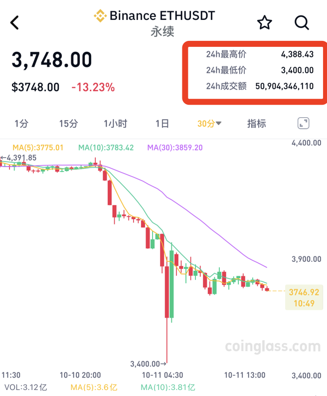 以太坊价格一度跌至3400美元,24小时跌幅超20%,现报3748美元/枚,成交额同样突破500亿美元。