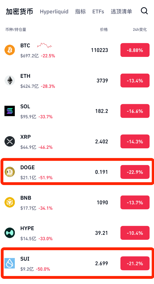 狗狗币、SUI等小市值币种跌幅更为惨烈,持仓量腰斩。