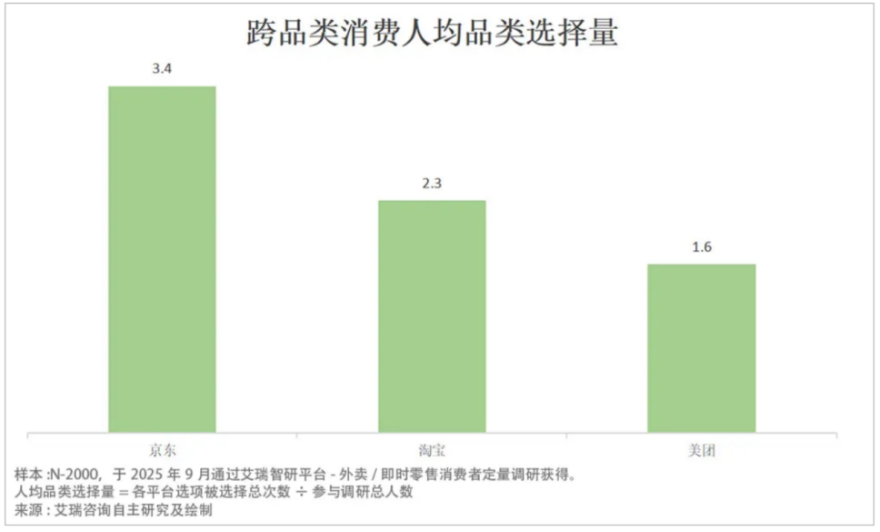 平均一位京东外卖消费者会在京东平台上选择3.4个商品种类,该数据在行业内位居首位,也就是说用户在下单京东外卖后,更倾向于在京东平台继续消费其他品类。