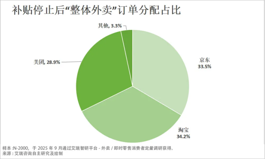 根据9月份的调研数据,在补贴退潮后,用户会将外卖订单相对平均地分配给三大平台,淘宝闪购/饿了么以34.2%的预期份额微弱领先,京东秒送/外卖紧随其后获得 33.5%,美团占据28.9%,三大巨头差距极小,无一方拥有绝对统治力,市场呈现高度胶着的竞争态势。