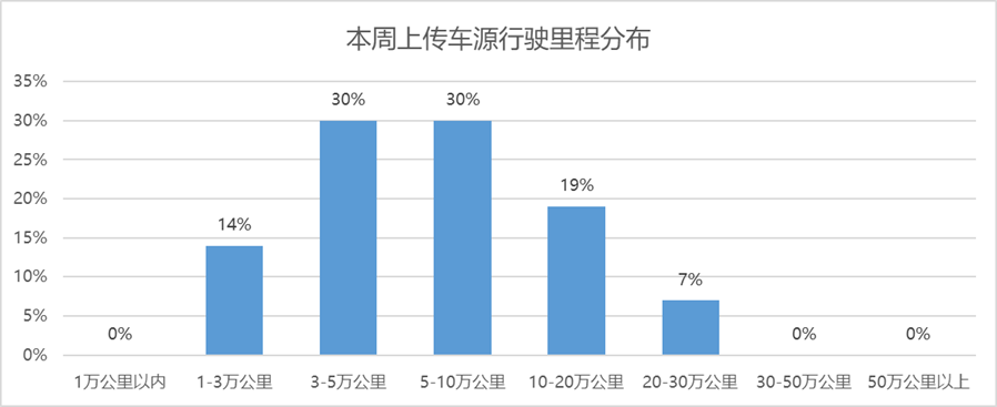从上传车源行驶里程数据来看,1万公里以内“准新车”、1-3万公里“精品车”数据、3-5万公里的“较新车”数据、5-10万公里的“性价比”及10万公里以上“老旧”车源数据均与上周保持一致,本周上报数据质量与上周持平。