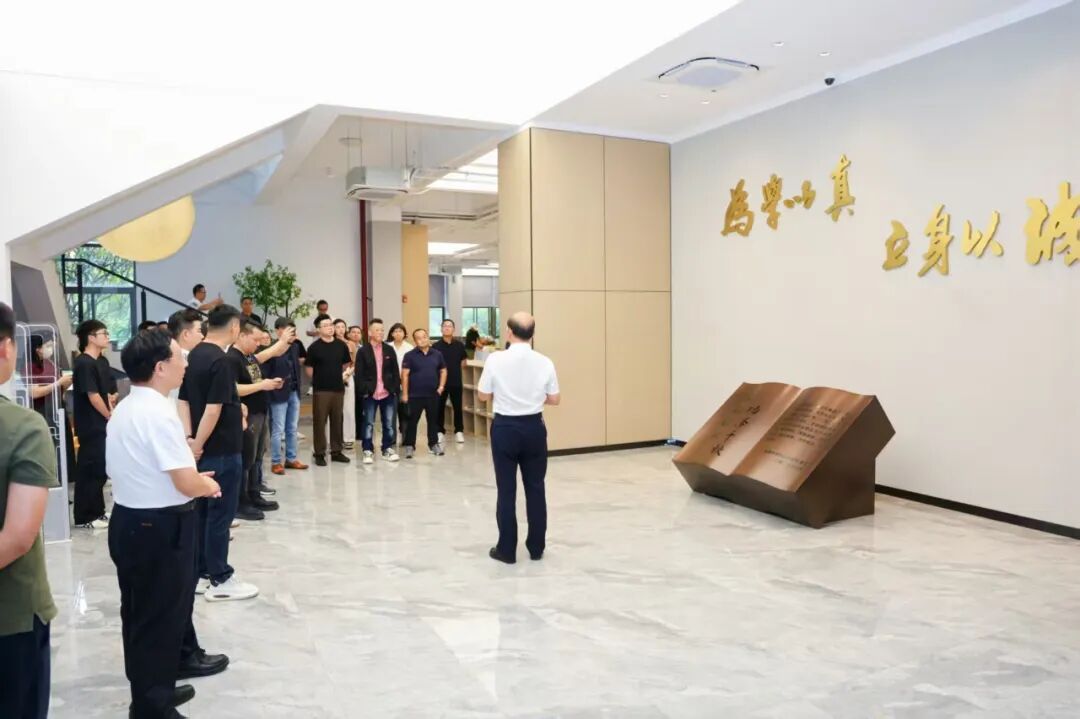 活动伊始,东莞中学松山湖学校柴松方校长带领与会嘉宾参观了校园图书馆,详细介绍了馆舍建设的发展历程,展示了学生优秀作品,并就图书馆的功能分区与整体布局作了专业讲解,充分展现了学校以文化人、以境育人的建设成果。