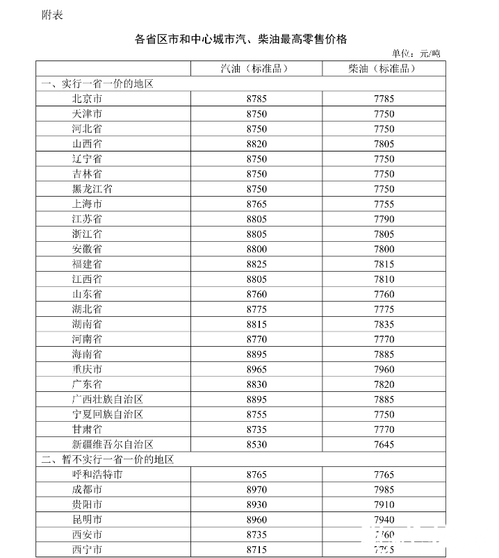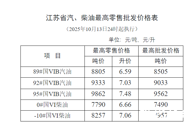 同时,根据江苏省发展改革委最新发布的江苏省成品油价格调整公告,江苏92号汽油最高零售价是9333元/吨,7.03元/升,批发价最高9033元/吨;95号汽油最高零售价是9862元/吨,7.48元/升,批发价最高9562元/吨。