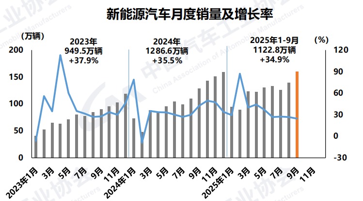 1至9月,我国新能源汽车产销分别完成1124.3万辆和1122.8万辆,同比分别增长35.2%和34.9%,新能源汽车新车销量达到汽车新车总销量的46.1%。其中,纯电动汽车累计销售722万辆,同比增长44.7%;插混汽车累计销售400.5万辆,同比增长20.4%。