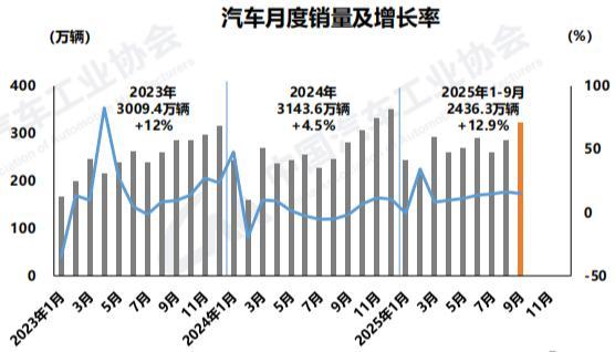 连续5个月同比增速超10%!9月我国汽车产销量首超300万辆 中汽协:2025年车市完成情况将好于预期