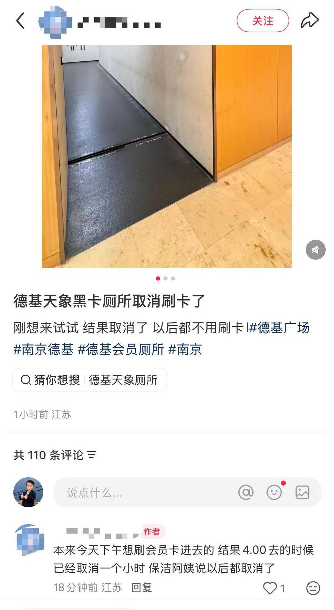 近日,南京德基广场内一处设置了智能玻璃门禁的“会员专属厕所”引发网友广泛关注。从网络流传图片可见,该厕所进口门上方及玻璃门处有标注“天象/黑卡会员专属”,玻璃门旁还配备了扫码验证设备。