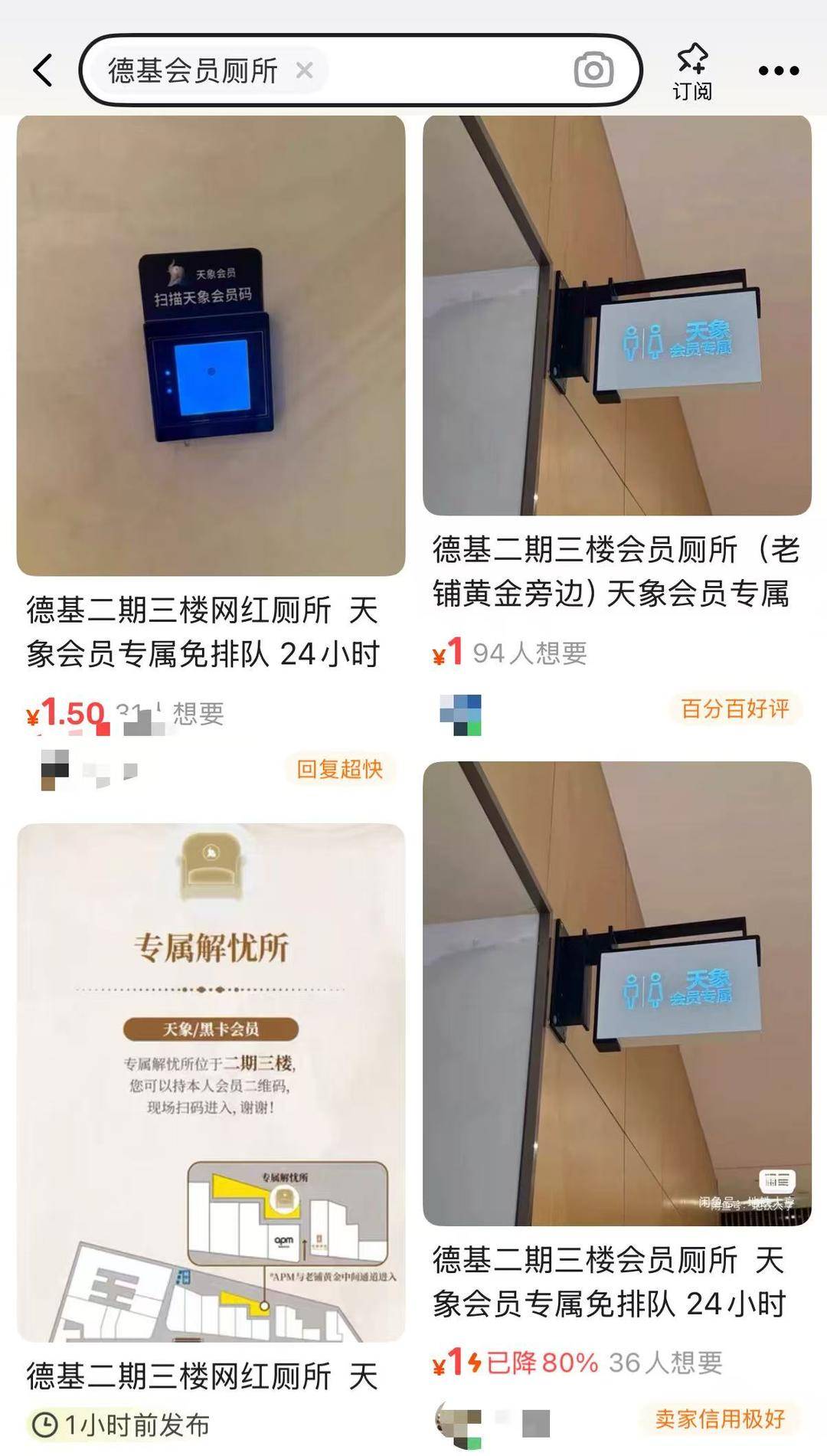 而到了10月14日下午,社交平台有网友发帖称,当天16时许前往德基广场时发现,此前需扫码进入的二期三楼的“天象/黑卡会员专属厕所”,已取消刷卡进入限制。记者联系到该发帖网友,对方表示,自己去的时候已经取消一个小时了,且表示“以后都取消了”。随后记者尝试联系德基广场工作人员进一步核实,对方表示暂不对外接受采访,提出可留下联系方式、进行反馈。截至发稿前,暂未收到相关回复。记者注意到,目前二手平台上会员专属厕所“通行码”相关商品也暂未下架,仍处于在售状态。
