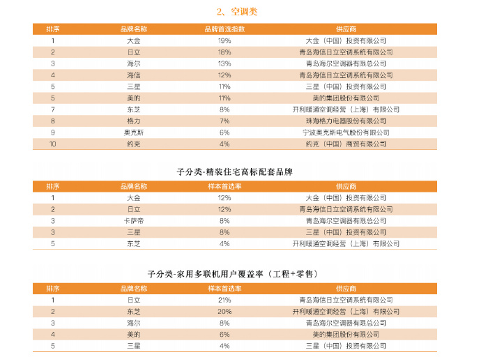在空调方面,《报告》还揭晓了精装住宅高标配套、家用多联机两大子分类榜单。大金、日立、卡萨帝、三星、东芝位列精装住宅高标配套子榜单前五名;日立、东芝、海尔、美的、三星位列家用多联机用户覆盖率子分类榜单前五名。