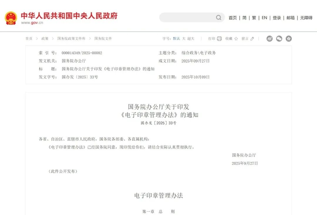 随着网络强国、数字中国建设深入推进,电子印章在政务活动和经济社会发展中的应用日益广泛。在此之前,北京、天津、陕西、山东、福建、广东等地相继颁布了电子印章管理相关的地方法规。由于缺乏国家层面的统筹规范,电子印章仍不同程度存在法律效力不强、管理主体不明晰、标准规范不健全等问题,特别是跨地区跨部门电子印章仍难以互信互认,这些都制约着电子印章功能作用和应用效能的充分发挥。通过制定《办法》,进一步规范和加强电子印章管理,推动电子印章深入应用和互信互认,对于构建数字时代信任体系、提升政务服务效能、促进营商环境优化和全国统一大市场建设具有重要意义。