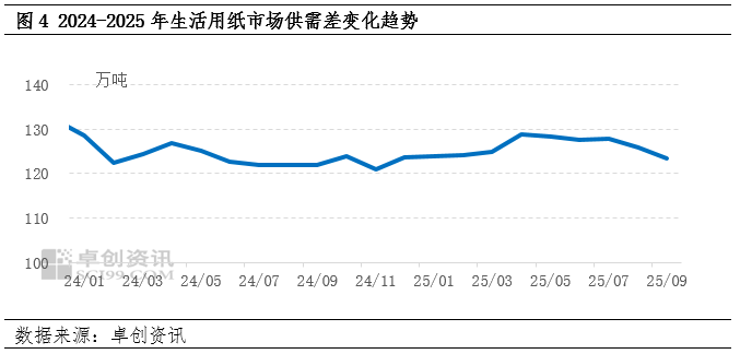 2025年三季度生活用纸市场供需关系呈现持续改善态势。从供需差变化情况来看,截至三季度末,市场供需差较二季度末收窄3.14%,显示出市场供需关系有所改善,对生活用纸价格形成一定利好支撑。