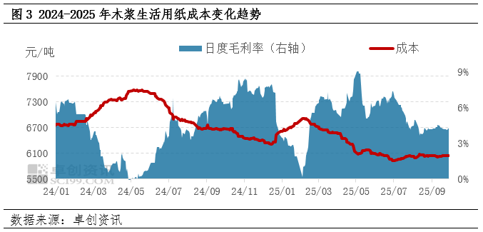 四季度市场需求先强后弱。从历史消费数据来看,10-12月生活用纸市场需求呈现"先增后降"的季节性特征。其中,10-11月受"双十一"促销活动带动,市场消费量环比提升;但促销活动结束后,需求增长动力将明显减弱。此外,距离春节备货周期尚有一定时间,12月市场需求端利好支撑作用逐步减弱。