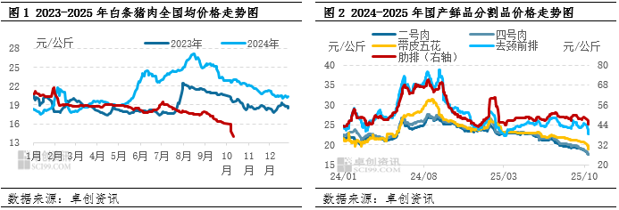 2025年中秋、国庆双节过后,国内鲜品猪肉价格持续下探,不断创年内新低,至月中旬价格已跌至近7年来的历史最低点。伴随着鲜冻价差收窄直至“倒挂”,国产及进口冻品分割品价格亦跟随下降,其中进口猪肉市场成交寡淡,部分市场处于有价无市的状态。后期来看,预计10月下半月猪肉价格反弹难度较大,11-12月份或先涨后降。
