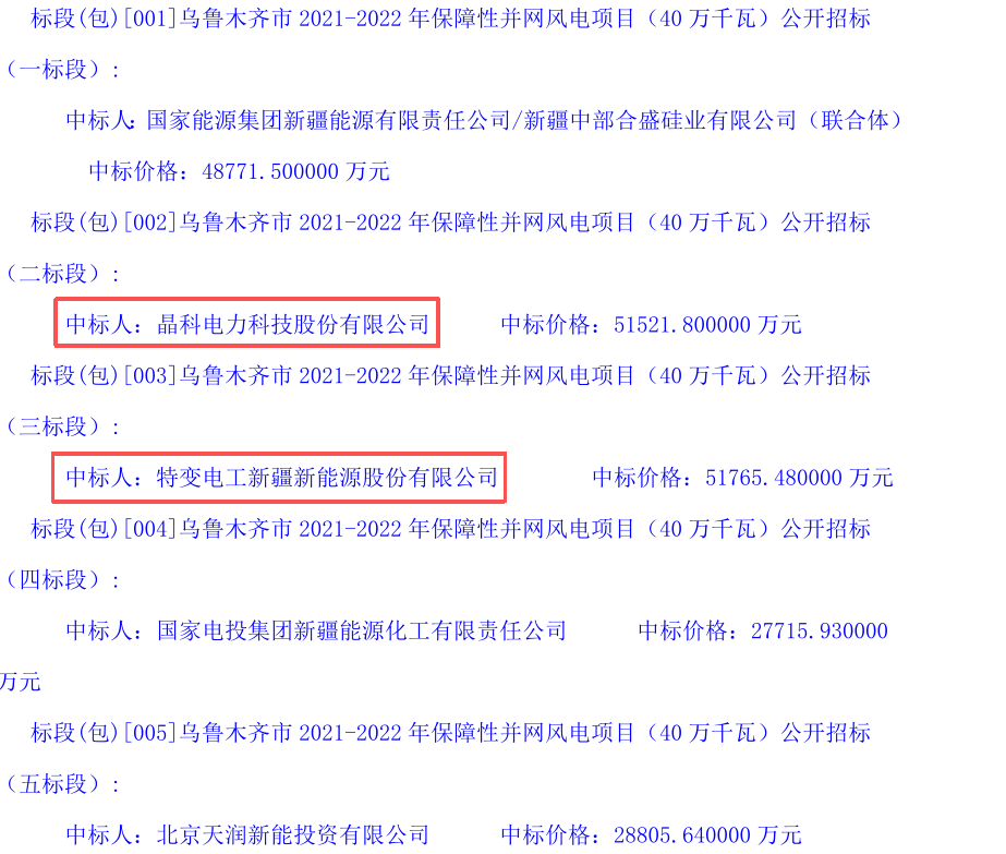 同样2022年3月,新疆乌鲁木齐市2021-2022年保障性并网风电项目(40万千瓦)中标结果公示,晶科科技和特变电工均中标了10万千瓦(100MW)的保障性并网风电项目。