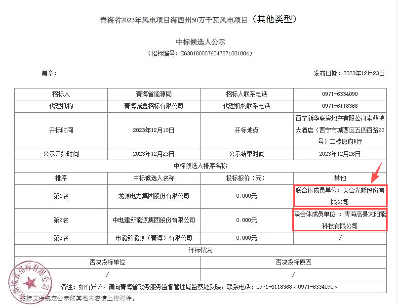 再看天合光能,早在2023年12月,该企业就作为联合体成员中标了青海省2023年风电项目海西州2GW风电项目第四标段(50万千瓦)。当时,作为联合体成员中标入围候选人名单的光伏企业还有高景太阳能。