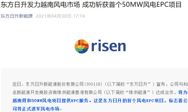 2021年4月,东方日升宣布将为越南得和50MW风电项目提供EPC服务,标志着该公司正式进军风电市场。