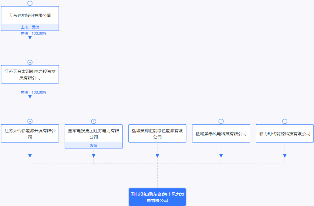 根据股权穿透,该公司股东名单中不仅有实力央企国电投,还有背靠江苏盐城政府的盐城黄海汇能绿色能源有限公司,以及光伏龙头天合光能旗下公司江苏天合新能源开发有限公司。