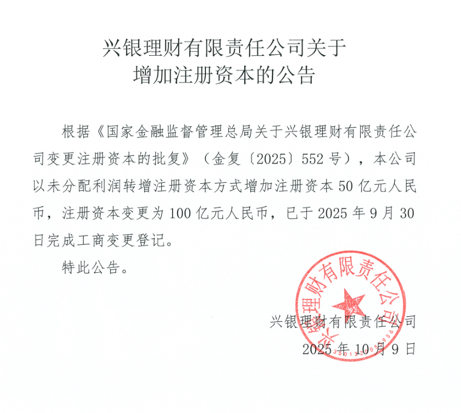 10月9日,兴银理财官网发布公告称,公司获批以未分配利润转增注册资本方式增加注册资本50亿元,注册资本变更为100亿元。此次增资已完成工商变更登记。