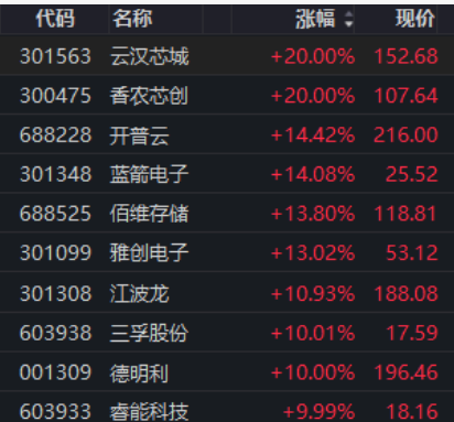 10月16日存储芯片盘中涨停部分个股,来源:同花顺iFinD