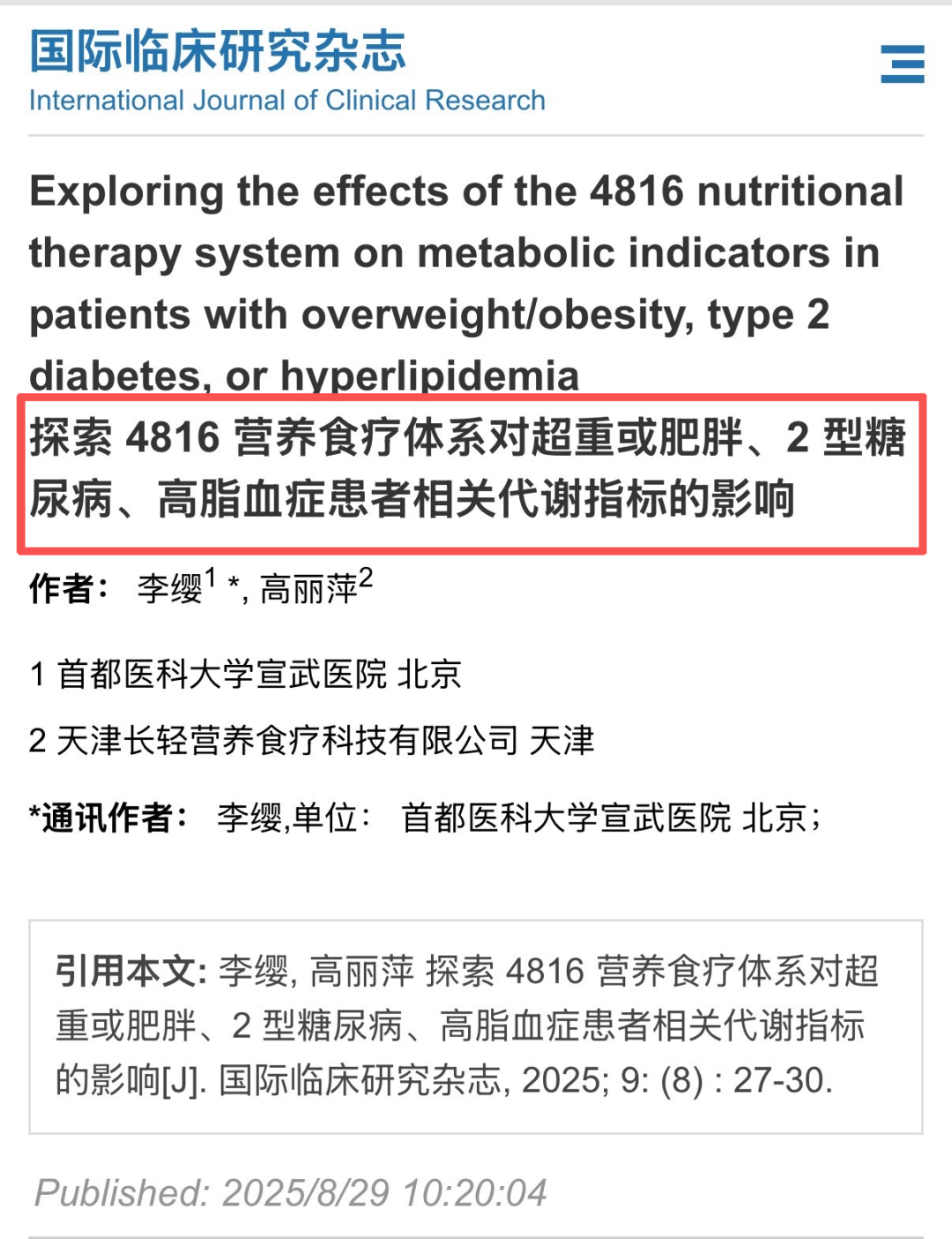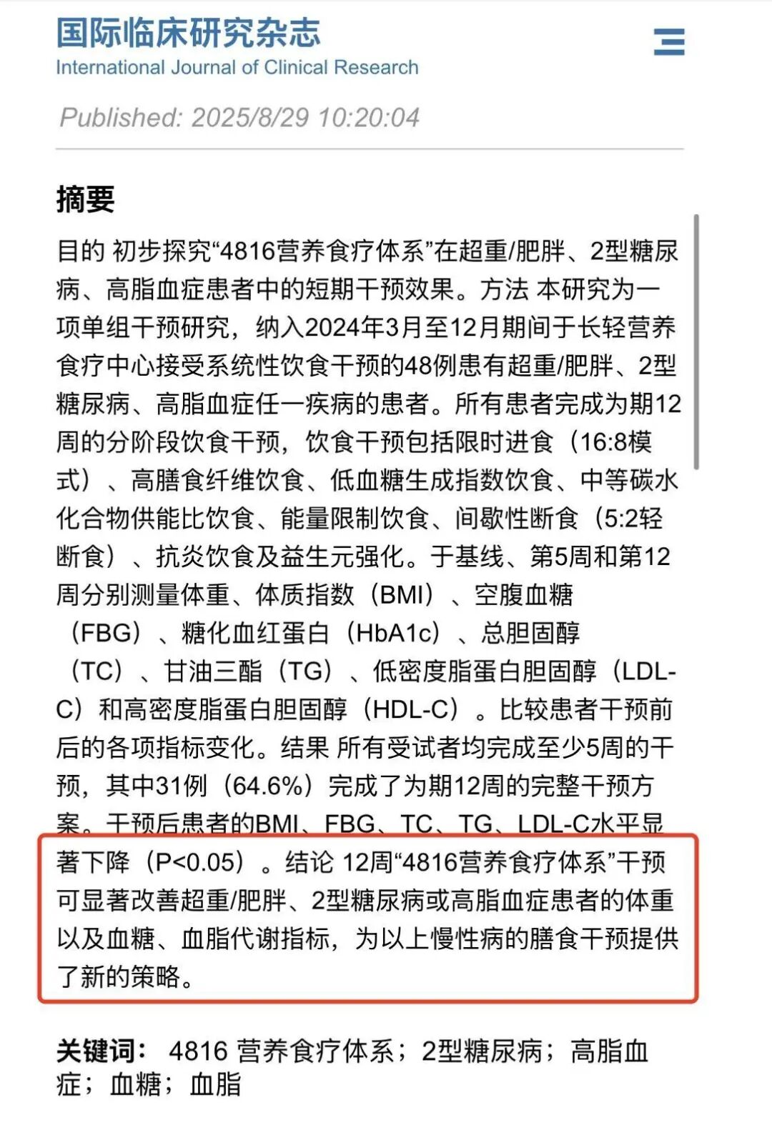 近日,一项发表于《国际临床研究杂志》的研究,为营养干预在慢性病管理中的作用提供了新的科学证据。该研究探索“4816营养食疗体系”对超重或肥胖、2型糖尿病、高脂血症患者相关代谢指标的影响。