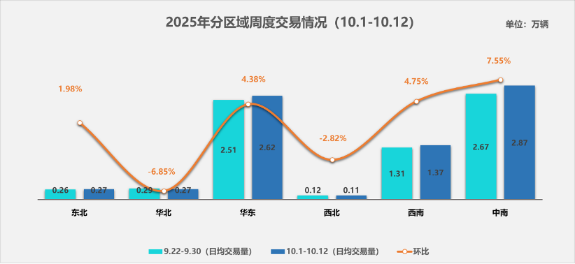 2025年10月1日-12日,二手车市场活跃度持续释放,日均交易量达7.51万辆,环比9月底增长4.98%。
