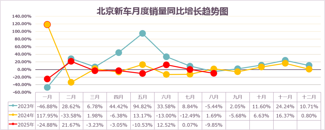 8月份北京新车交易5.71万辆,环比下降5.41%,同比下降9.85%。环比增幅低于全国15.51个百分点,同比增幅低于全国26.25个百分点。