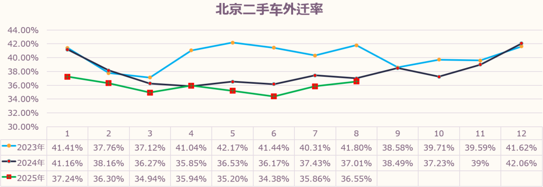 8月份北京二手车交易外迁率为36.55%,外迁率环比上升0.69个百分点,同比下降0.46个百分点。