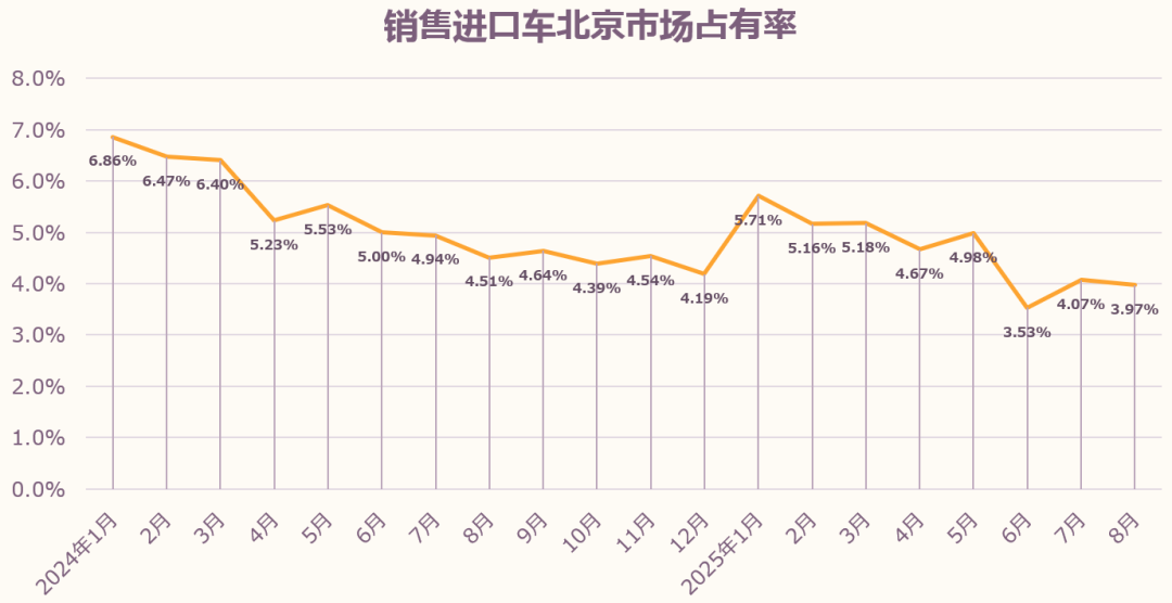 8月北京进口车销量占北京新车交易总量的3.97%,占有率环比下降0.1个百分点,同比下降0.54个百分点。