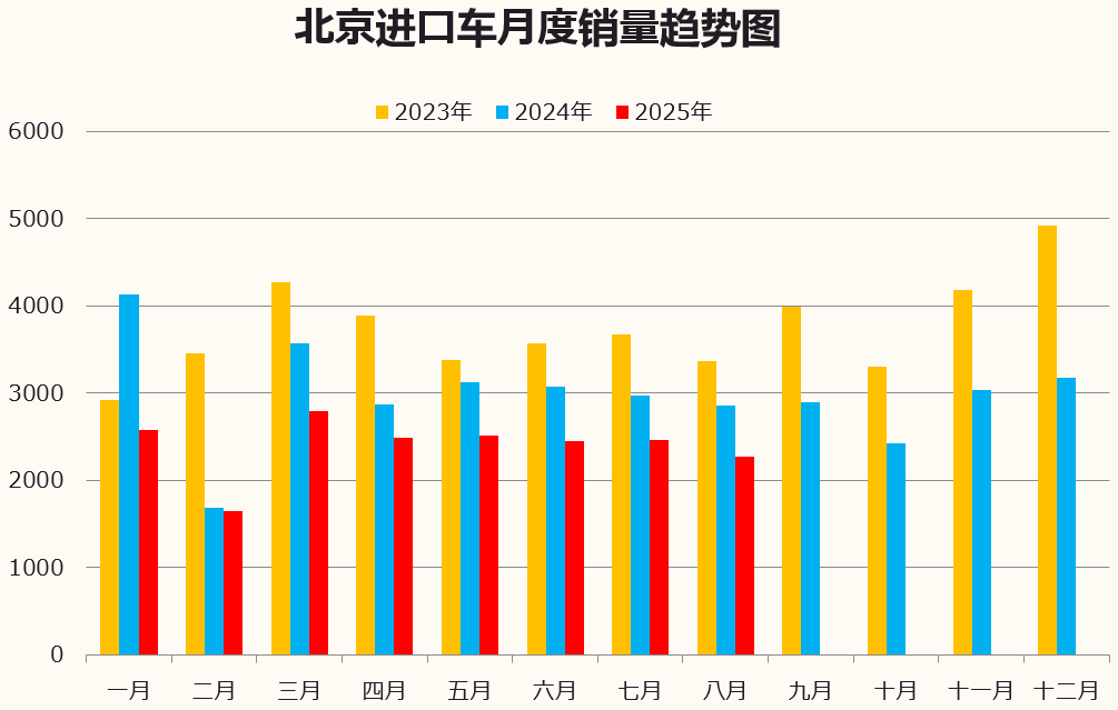 8月份北京市进口车交易2268辆,环比下降7.69%,同比下降20.59%。