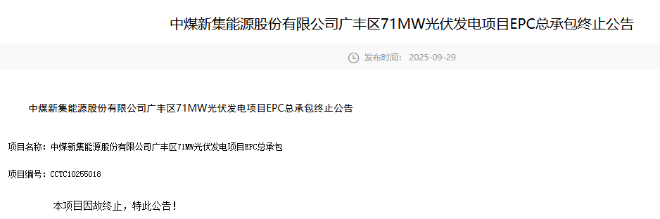 9月29日,中煤新集能源股份有限公司广丰区71MW光伏发电项目EPC总承包发布终止公告。公告显示,项目因故终止。