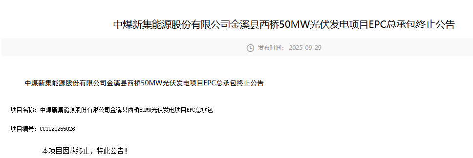 9月29日,中煤新集能源股份有限公司金溪县西桥50MW光伏发电项目EPC总承包发布终止公告。公告显示,项目因故终止。