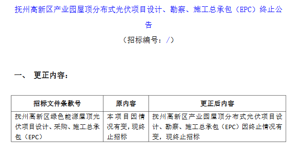10月14日,抚州高新区产业园屋顶分布式光伏项目设计、勘察、施工总承包(EPC)终止。终止原因为本项目情况有变。