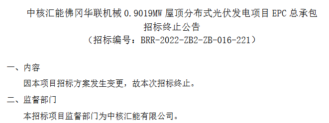 10月14日,中核汇能佛冈华联机械 0.9019MW屋顶分布式光伏发电项目EPC总承包发布招标终止公告。终止原因系本项目招标方案发生变更。