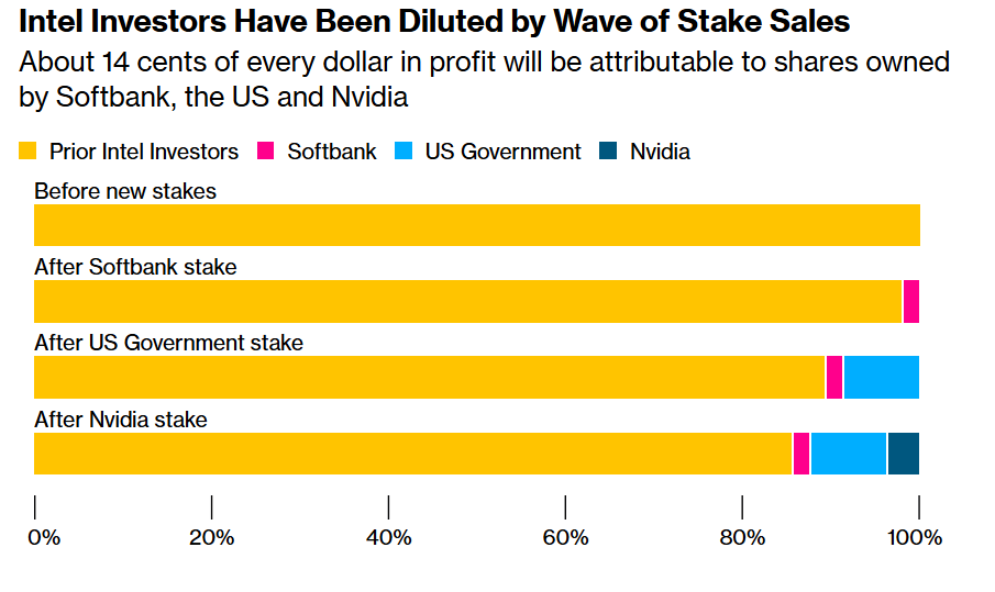 随着英特尔投资者们在一波股权出售中遭遇稀释,每一美元利润中约有 14 美分将归属于软银、美国政府和英伟达所持股份。