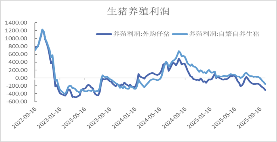 首先,养殖利润是养殖企业进行产能决策的关键因素。9月养殖端计划出栏量环比增加,市场积极出栏,市场供应宽松,需求仅有小幅改善,现货价格跌破13元/公斤,最低跌至12.85元/公斤下跌,幅度7.1%。由于生猪价格下跌幅度超过饲料价格,养殖利润进一步萎缩,自繁自养养殖利润由盈转亏,外购仔猪养殖利润亏损进一步扩大。根据博亚和讯数据,外购仔猪自2025年7月下旬以来呈现亏损状态,且亏损幅度呈现不断扩大趋势,自繁自养养殖利润在9月下旬由盈转亏。行业养殖利润进入亏损,加之供需偏松格局导致市场对短期行情预期悲观,刺激养殖端积极出栏,打压仔猪和母猪的补栏积极性。