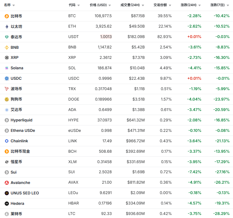 刚刚过去的24小时内,加密货币集体跳水,比特币一度从11.15万美元跌至10.75万美元,盘中跌幅一度超过3.5%。以太坊盘中也一度跳水超5%,BNB、Solana等纷纷跟跌。截至记者发稿时,比特币、以太坊、XRP跌超2%,BNB、艾达币跌3%,Solana跌超4%。