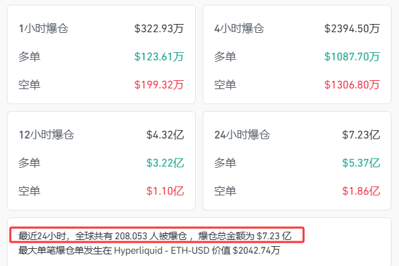 Coinglass数据显示,过去24小时内,加密货币市场全网合约爆仓7.23亿美元,爆仓人数达到20.8万人。其中,多单爆仓5.37亿美元,空单爆仓1.86亿美元。最大单笔爆仓单发生在Hyperliquid-ETH-USD,价值2042.74万美元。