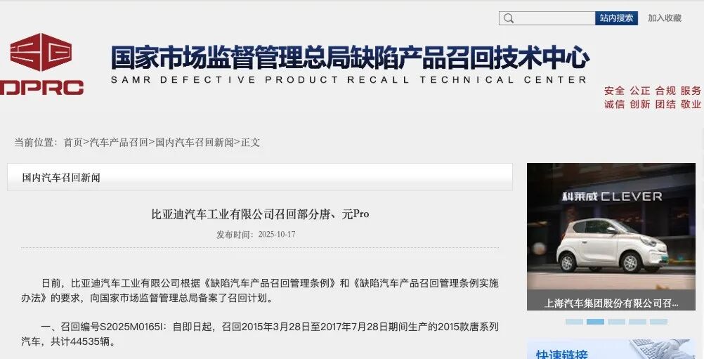 一、召回编号S2025M0165I:自即日起,召回2015年3月28日至2017年7月28日期间生产的2015款唐系列汽车,共计44535辆。