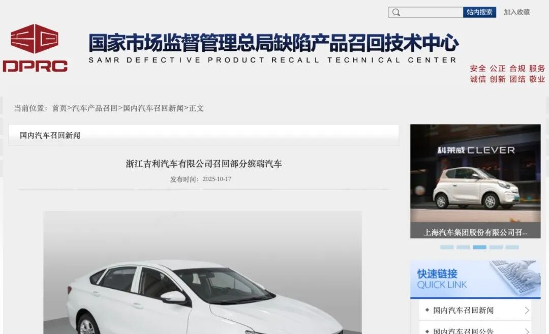 浙江吉利汽车有限公司召回部分缤瑞汽车