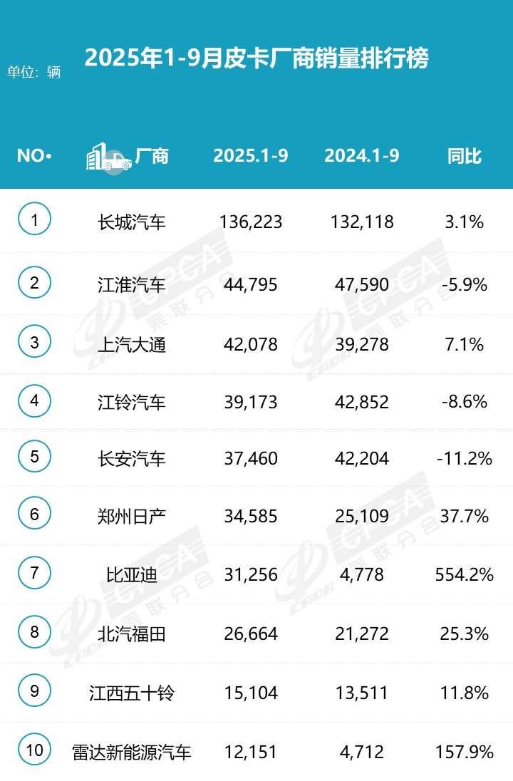 10月17日,乘联分会发布2025年9月皮卡厂商批发销量排名快报。2025年9月份皮卡市场销售4.6万辆,同比降1.9%,环比上月增14.6%,处于近5年的中高位水平。2025年1-9月份皮卡市场销售43.2万辆,同比2024年1-9月增11.2%。