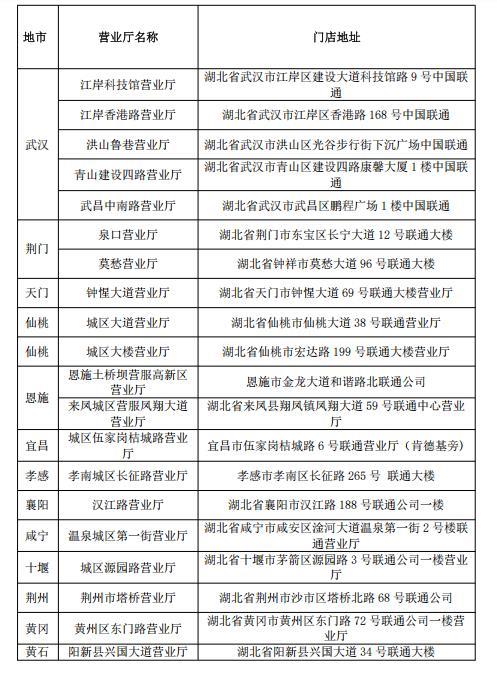 为方便全省用户就近体验和办理,湖北联通已在包括武汉、荆门、宜昌、孝感、恩施、襄阳、咸宁、十堰、荆州、黄冈、黄石以及汉江在内的20家指定营业厅完成布局,全面支持现场办理,授权营业厅完整名单如下: