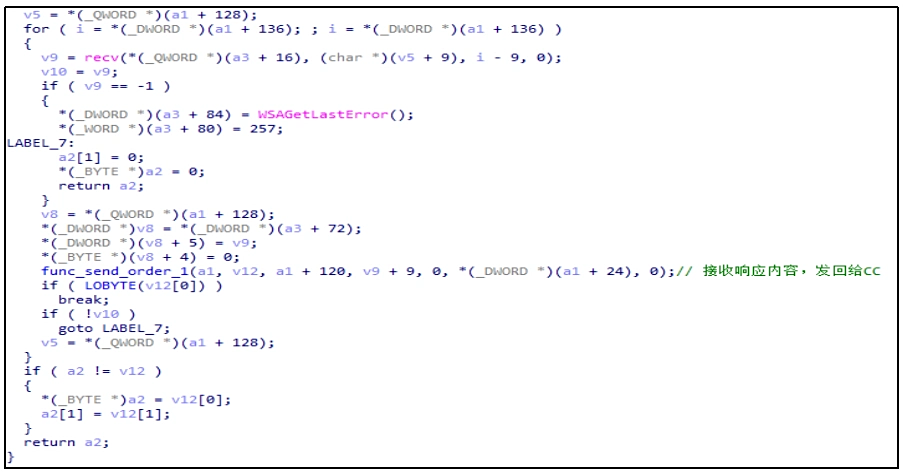 “Back_Eleven”具有主动回连和被动监听两种工作模式:在主动回连模式下,“Back_Eleven”解密内置的主控端控制服务器 IP 地址,并使用内置的 RSA 加密算法公钥完成密钥交换,然后使用 AES 算法将上线信息加密后,利用 TLS 协议加密传输到主控端;在被动监听模式下,“Back_Eleven”通过监听 Windows 系统网卡流量,筛选主控端发送的特定条件数据包,实现主控端命令执行。