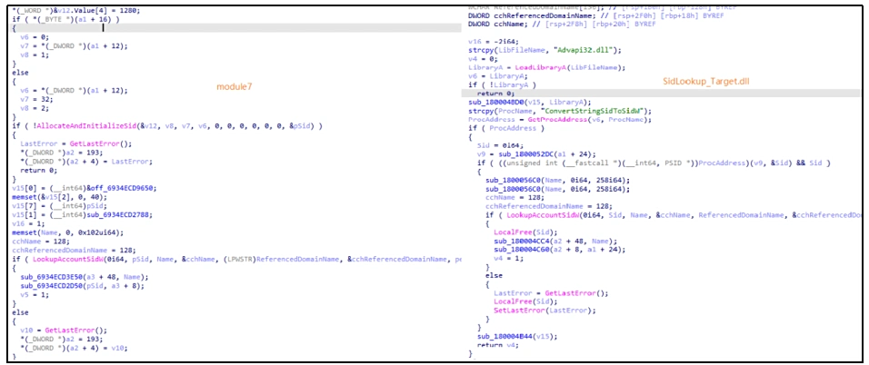 ▲ module7(左)与 SidLookup_Target.dll(右)代码同源性对比