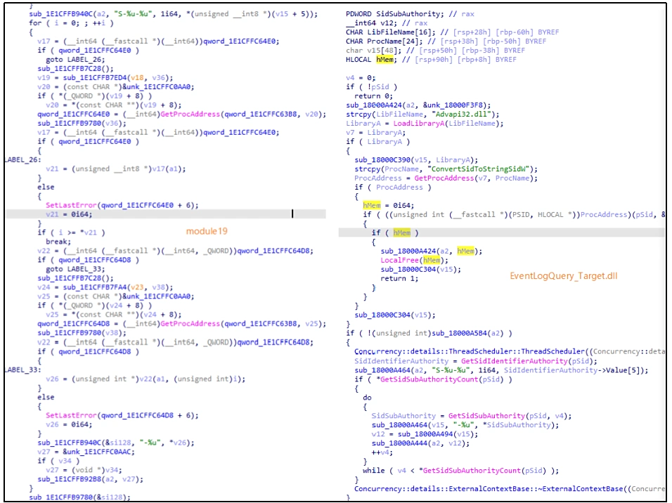▲ module19(左)与 EventLogQuery_Target.dll(右)代码同源性对比