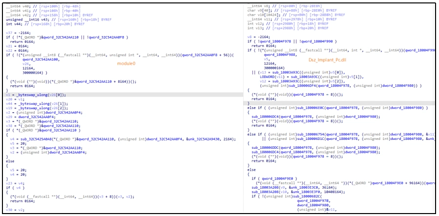 ▲ module0(左)与 Dsz_Implant_Pc.dll(右)代码同源性对比