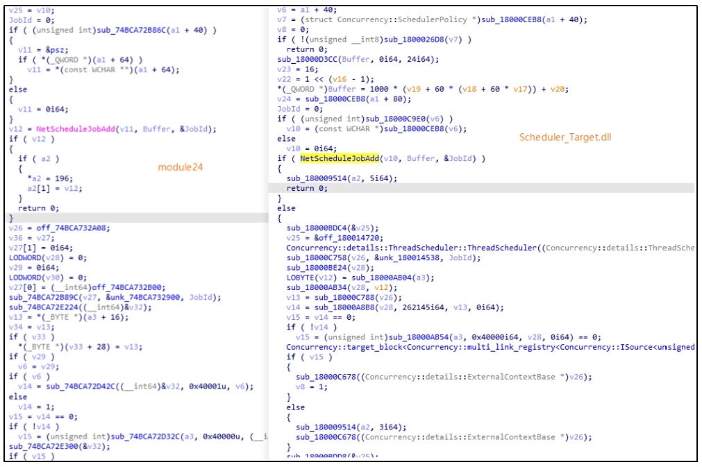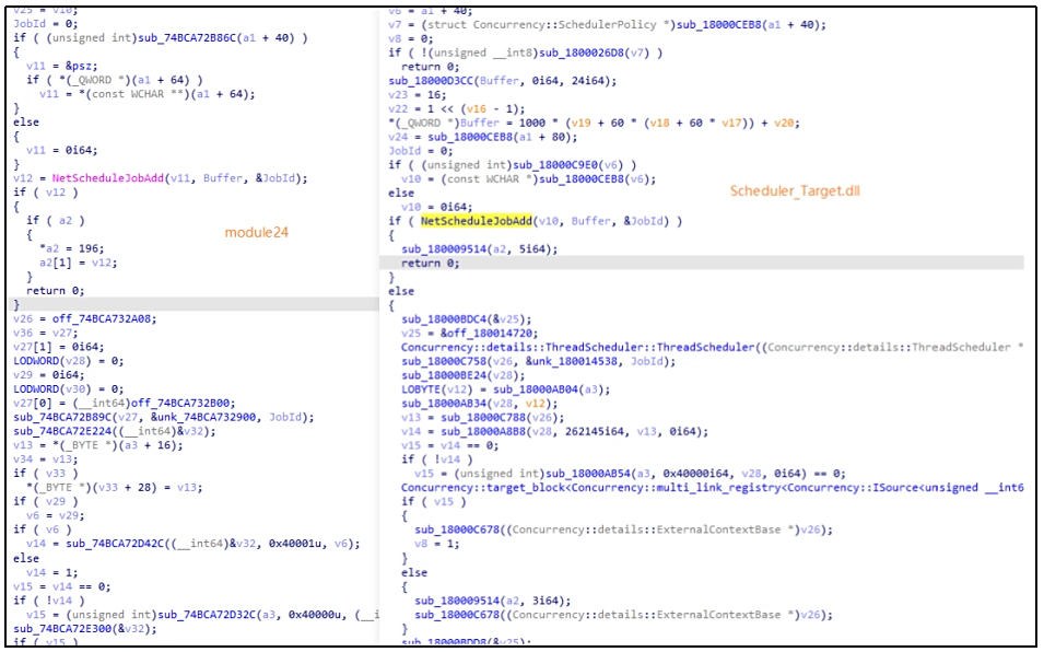 ▲ module24(左)与 Scheduler_Target.dll(右)代码同源性对比 (二)样本驻留方式