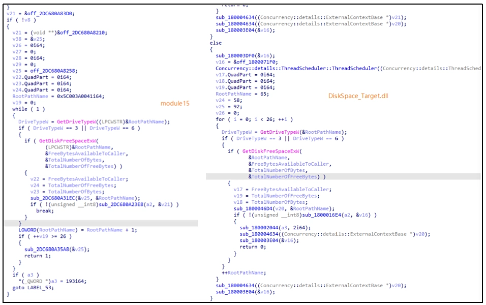 ▲ module15(左)与 DiskSpace_Target.dll(右)代码同源性对比