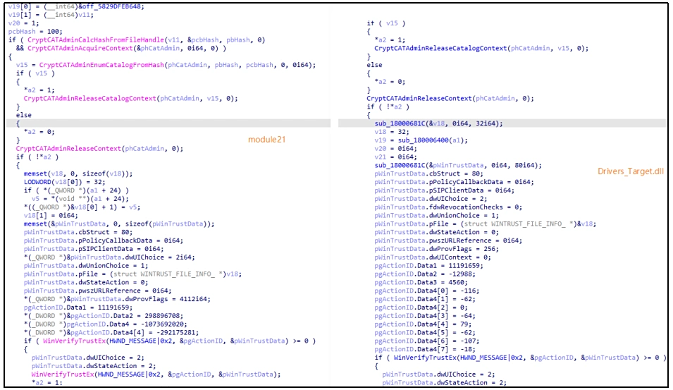 ▲ module21(左)与 Drivers_Target.dll(右)代码同源性对比