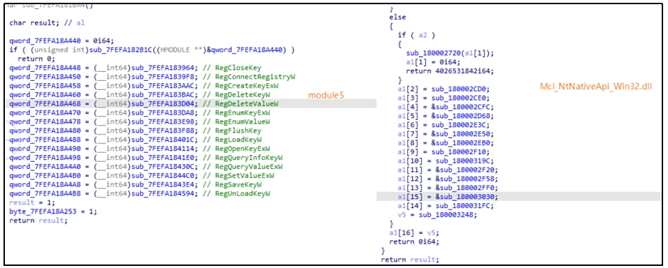 ▲ module5(左)与 Mcl_NtNativeApi_Win32.dll(右)代码同源性对比