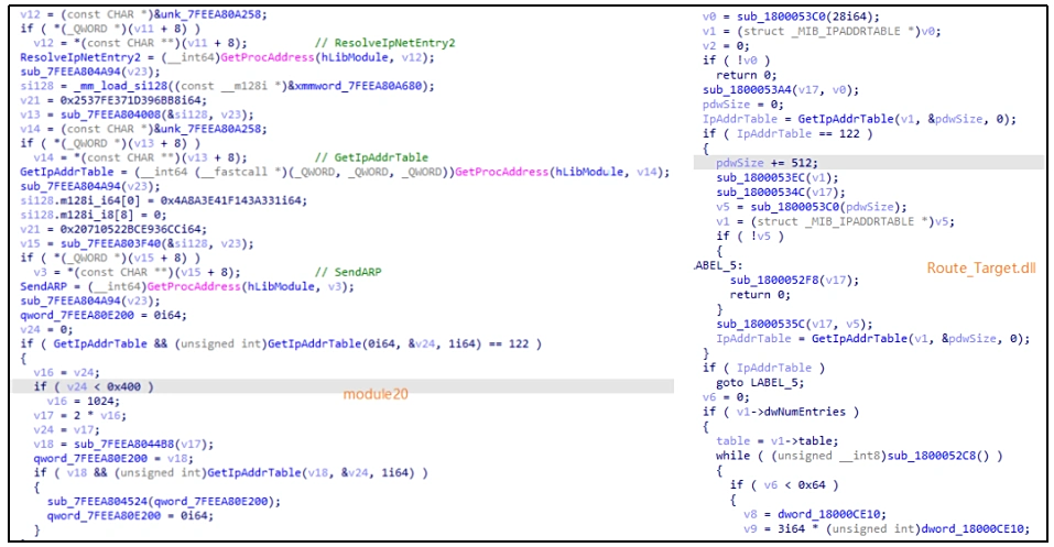 ▲ module20(左)与 Route_Target.dll(右)代码同源性对比