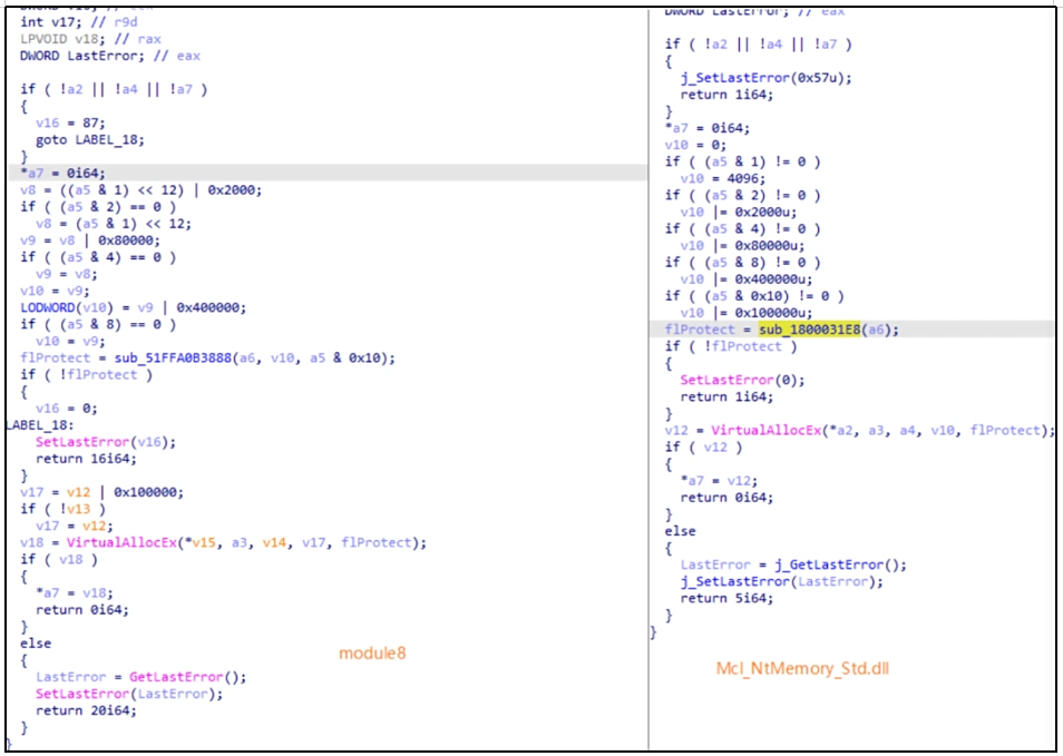 ▲ module8(左)与 Mcl_NtMemory_Std.dll(右)代码同源性对比